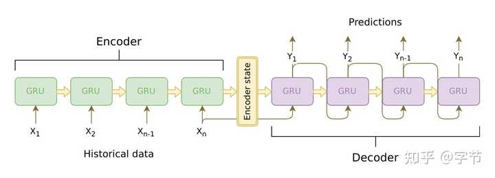 这就是前面提到的 Web Traffic Forecasting 比赛冠军方案中主要采用的模型。基本是借鉴了 NLP 里的经典架构, 使用 RNN/GRU/LSTM 作为基本单元,encoder 中做训练窗口中的信息提取,然后在 decoder 中做预测 horizon 的多步输出 。作者在方案里还尝试了在 decoder 时同时引入 注意力机制 ,但发现效果并不稳定,最后直接改成了 lag 特征来捕捉固定周期的历史信息 。