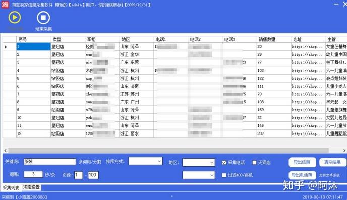 以淘宝商家信息采集为例,记者在该系统中的淘宝商家采集功能中输入关键词“服装”后,成功采集到北京地区淘宝卖家的82条信息,共耗时10分钟。在软件弹出框右下角还附有“导出电话铺”的按钮,采集得到的信息包括类型(店铺等级)、掌柜名称、地区、电话、店址等多个维度。
