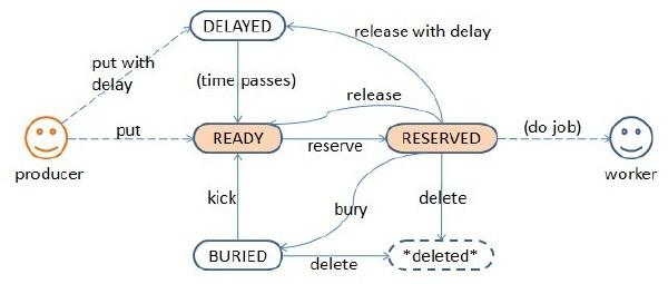 Beanstalkd 利用任务(job) 代替消息(message) 的概念,每一个任务都有以下几种状态: