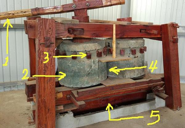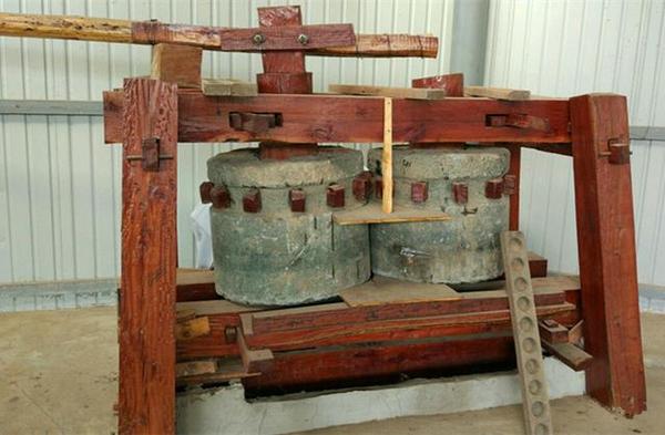 照片看不出这套“榨汁机”高大雄壮,在现场才能体会到,两个石辘每个至少在一吨以上,需要两头大水牛才能拉动。