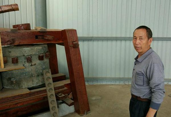 百意佳食品公司的朱庭厚老先生接待了我们,向我们介绍了牛拉石辘的使用方法。先上一张古代甘蔗“榨汁机”的照片: