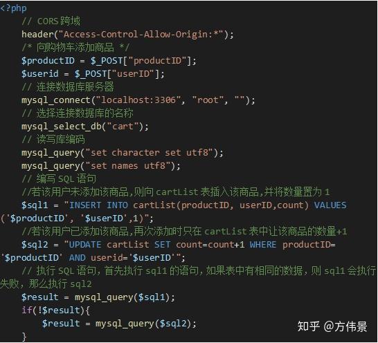 加入购物车的点击事件大致步骤为:用户点击“加入购物车”按钮==>页面获取当前商品唯一值(如商品ID:productID)==>JS处理点击事件,将唯一值连同用户信息通过ajax请求传送给PHP===>PHP向服务器请求连接===>数据库语句执行===>服务器将执行结果返回给PHP===>PHP将执行结果传送给前端。