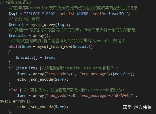 4.当用户进入购物车时,页面要请求该用户在数据库中的购物车表cartList,此时查询结果应该为一个数组,数组里的每一个子元素对应一个唯一的商品对象,数据库查询语句如下:
