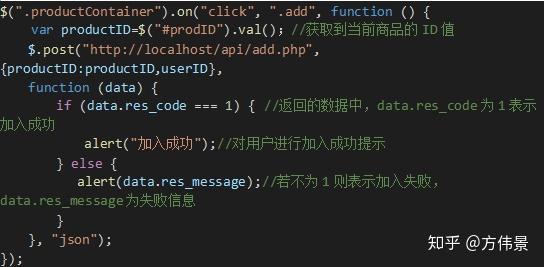 2.JS中的数据请求处理实例如下,加入购物车的请求的api文件路径为http://localhost/api/add.php,此时将点击加入的商品ID及操作的用户ID封装为对象,用ajax的post请求传给服务端
