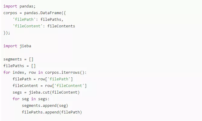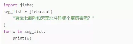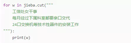 jieba.cut以及jieba.cut_for_search返回的结构都是一个可迭代的generator,可以使用for循环来获得分词后得到的每一个词语(unicode),也可以用list(jieba.cut(...))转化为list代码示例( 分词 )