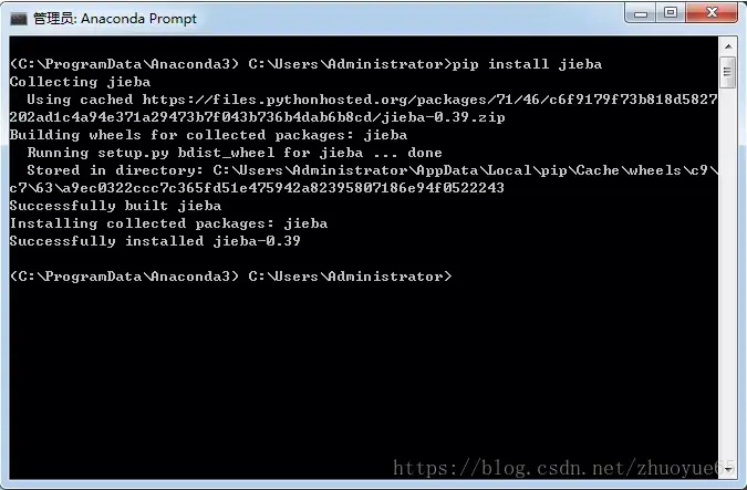 然后我再anaconda 环境下也安装了jieba,先在Anaconda3\Lib这个目录下将jieba0.39的解压缩文件放在里面,然后在Anaconda propt下输入 pip install jieba,如下图:
