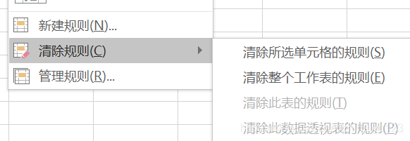 清除规则:清除所选单元格的规则 清除整个工作表地规则 清除此表的规则 清除此数据透视表的规则