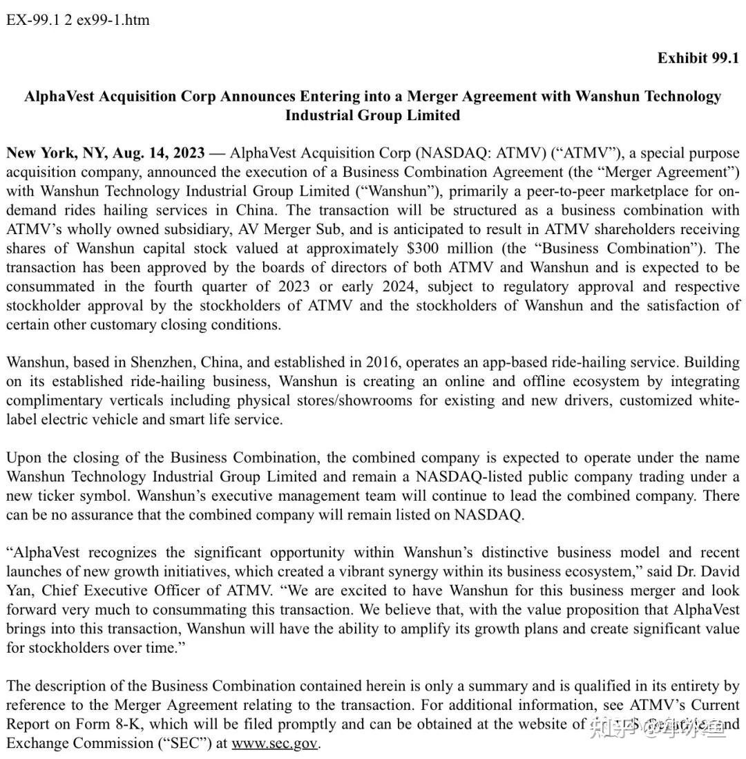 刚刚SPAC:AlphaVest Acquisition Corp(纳斯达克:ATMV),一家特殊目的收购公司,宣布与万顺科技产业集团签署了一份合并协议。ATMV的全资子公司AV Merger Sub将与万顺科技进行合并,根据协议,此次交易万顺科技的估值约3亿美元。在满足万顺科技2023年营收为45亿人民币的特定业绩目标或交割前万顺科技获得金额至少为2.15亿美元的融资要求后,ATMV将向万顺科技股东额外释放价值约40亿美元股份,万顺科技的估值将达约43亿美元。该合并交易尚需等待监管机构及双方股东批准,以及满足若干交割条件,预计将于2024年上半年完成。业务合并完成后,合并公司预计将更名为“万顺科技”,并继续在纳斯达克上市,交易使用新的股票代码。万顺科技现有的管理团队将继续领导合并后的公司。