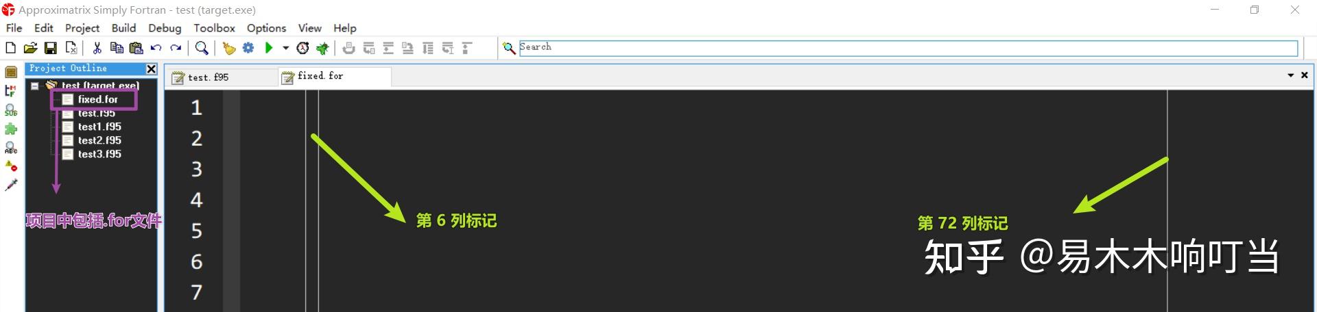 关于固定格式的列标记,木木想再进一步给大家演示一下,Fortran 的固定格式只能在第 7~72 个字符位置 编写程序,第 6 个字符位置放置 0 以外的数字表示续行 ,第 1~5 个字符放置数字表示行代码,或空格,Simply Fortran对于后缀名为 .f、.for 的文件就可以很方便的显示第 6 和第 72 个字符的位置。