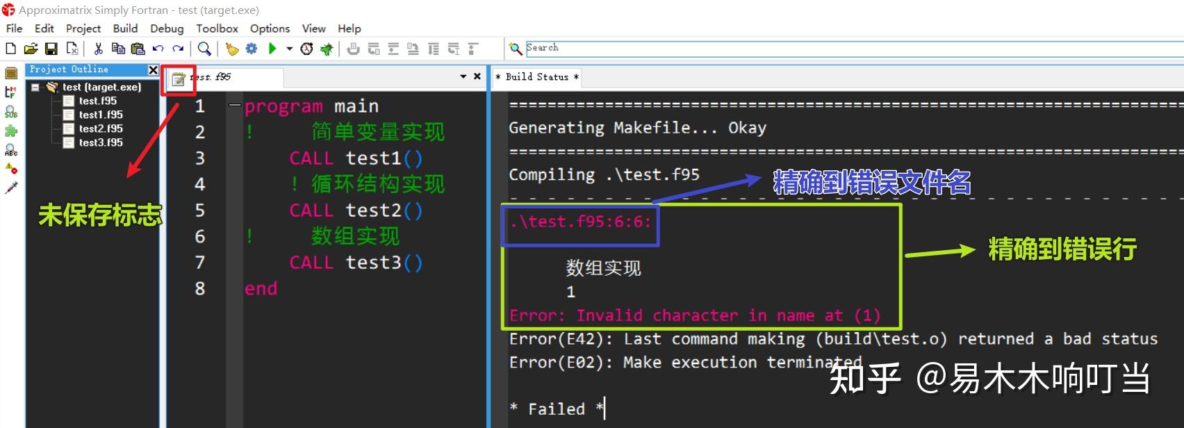 Step 4 改动文件再运行时,应先“Ctrl+S”,不然会出现如下错误,Simply Fortran 会将出错的文件名及对应行进行标记,双击即可跳转该行。分享常用的快捷键: Ctrl+R 注释; Ctrl+T 取消注释。