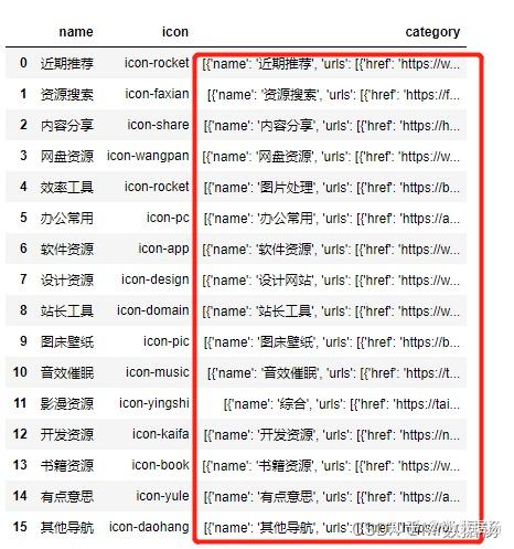 例如想构建个人导航页面,其中数据又不想一个一个复制的话,通过爬虫可以获得下面的json数据。