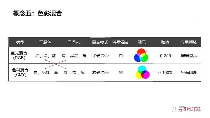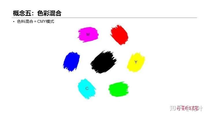 而对于 色料的混合 ,比说画画的颜料,它的 三原色是青、品红、黄 ,取英文首字母就是CMY。青色颜料+品红颜料得到蓝色,品红+黄色可以得到红色,黄色+青色可以得到绿色,三种原色等量混合得到黑色。