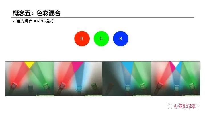 红色光与绿色光混合成黄色光,红光与蓝光混合成品红色的光,绿与蓝混合成青色,