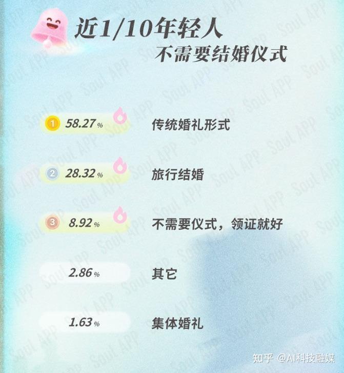 在SOUL研究院出具的报告中,有接近一成的年轻人不需要结婚仪式,但相比而言,还是需要婚庆的人占大多数,其中有58.27%的人需要“传统婚礼形式”,有28.32%的人选择“旅行结婚”。