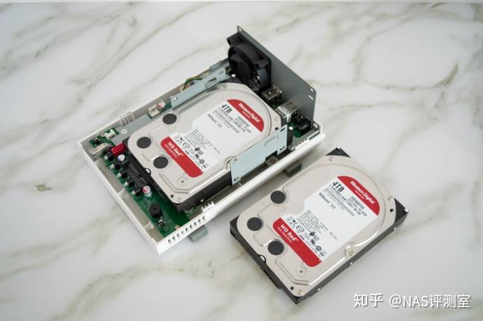 作者使用2块西数红盘4TB装入其中,第一块需要装上并拧紧两侧螺丝,第二块需要通过包装盒附赠的SATA线连接,并且还要用螺丝将两侧固定。