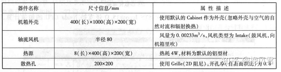 模型结构如图,包含一个轴流风机、散热孔、5个发热器件、机箱外壳,模型属性如表所示,对该结构进行热分析。