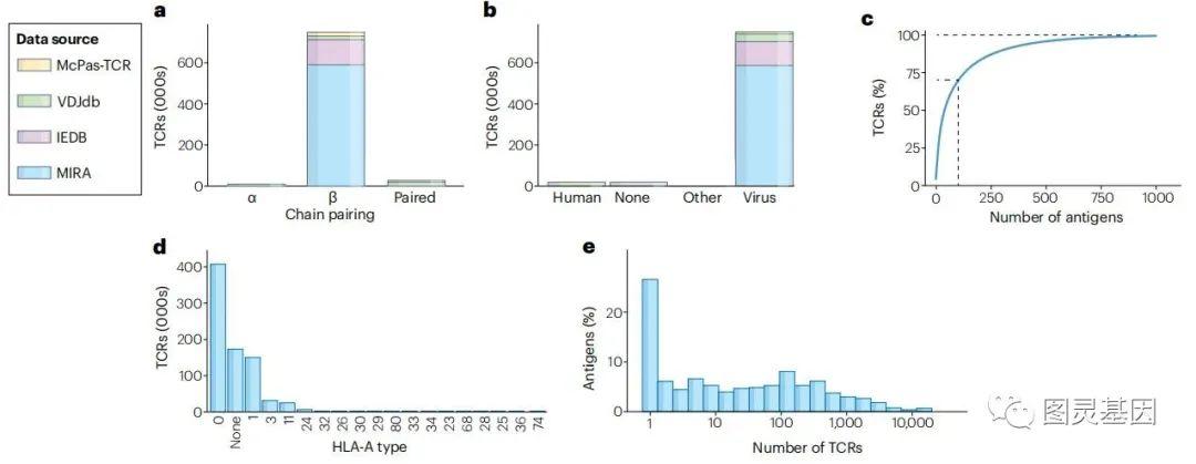 抗原-MHC多聚体可用于使用大量(合并)T细胞群或更新的单细胞方法来确定TCR特异性。批量的方法被广泛使用且相对便宜,但不提供关于αβ TCR链配对或功能的信息。因此,单链TCR序列在公共数据集中占主导地位(图2)。