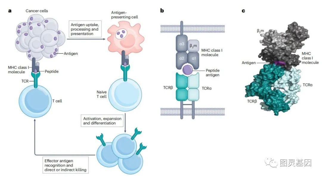 T细胞通常通过表面表达的高度多样的异二聚体T细胞受体(TCR)识别MHC蛋白家族成员上呈现的抗原(图1)。