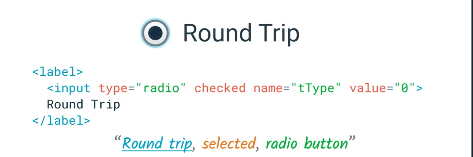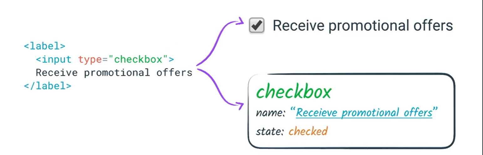 如果我们创建一个普通的复选框,屏幕阅读器会读出它是复选框,告诉你它的标签,并告诉你是否已选中。