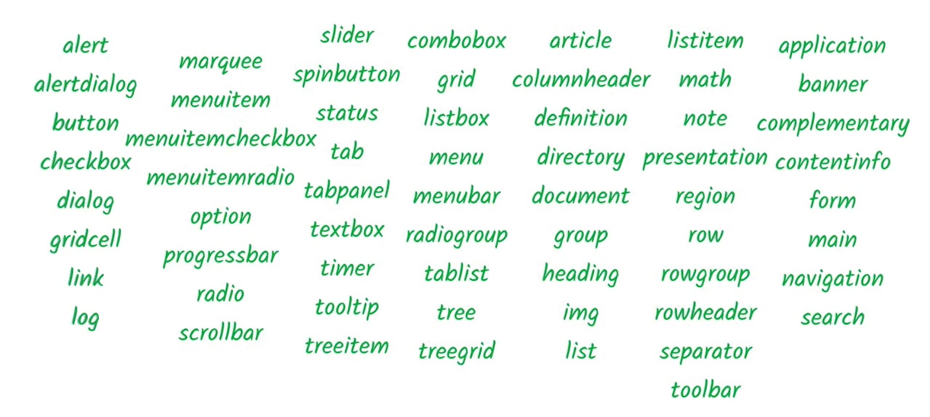 ARIA的核心方面之一是角色集合,角色(Role)是一个无障碍术语表示特定UI模式的简写。