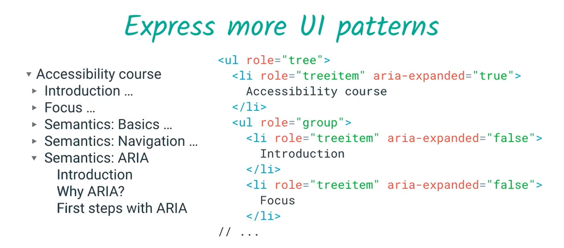 如上图的文本是一个树结构小部件,可以用来浏览本课程,我们可以在无序列表的基础上添加ARIA角色tree treeitem和group并添加aria-expanded属性来表达这个小部件的语义。