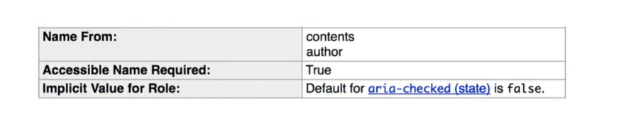 Name from 表示名称是否来自元素的文本内容,例如按钮元素或需要通过其他机制提供,例如原生HTML单选按钮输入,这里的选项之一contents表示元素的文本内容将作为无障碍标签,author表示作者必须明确提供名称,Accessible Name Required表示该设置通常为true但并非始终为true,Implicit value for role表示aria-checked的默认值是false,单选按钮将表示为未选中。