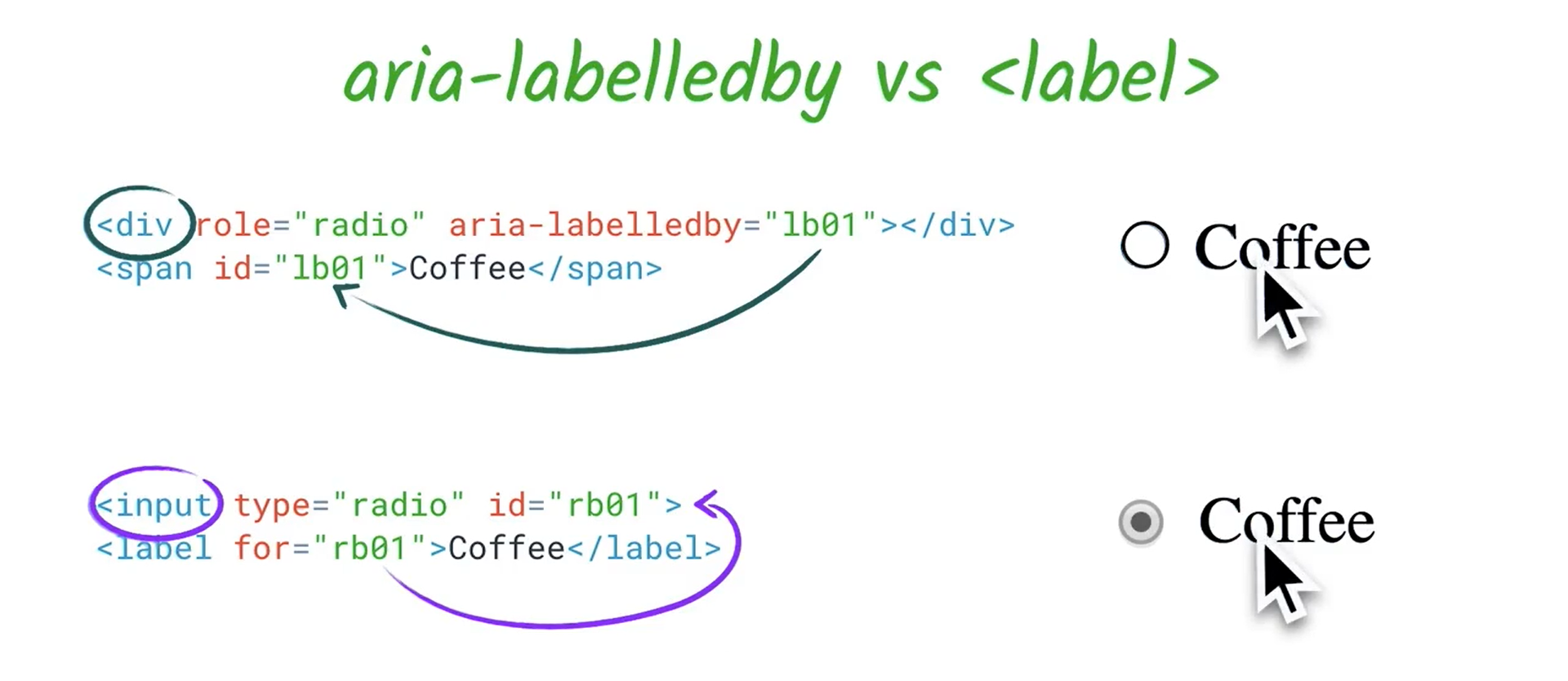 但对于aria-labelledby来说,关系是相反的,被加标签的元素指代为其添加标签的元素,因为aria仅影响无障碍树,因此aria-labelledby无法提供像标签元素那样方便的标签点击行为。