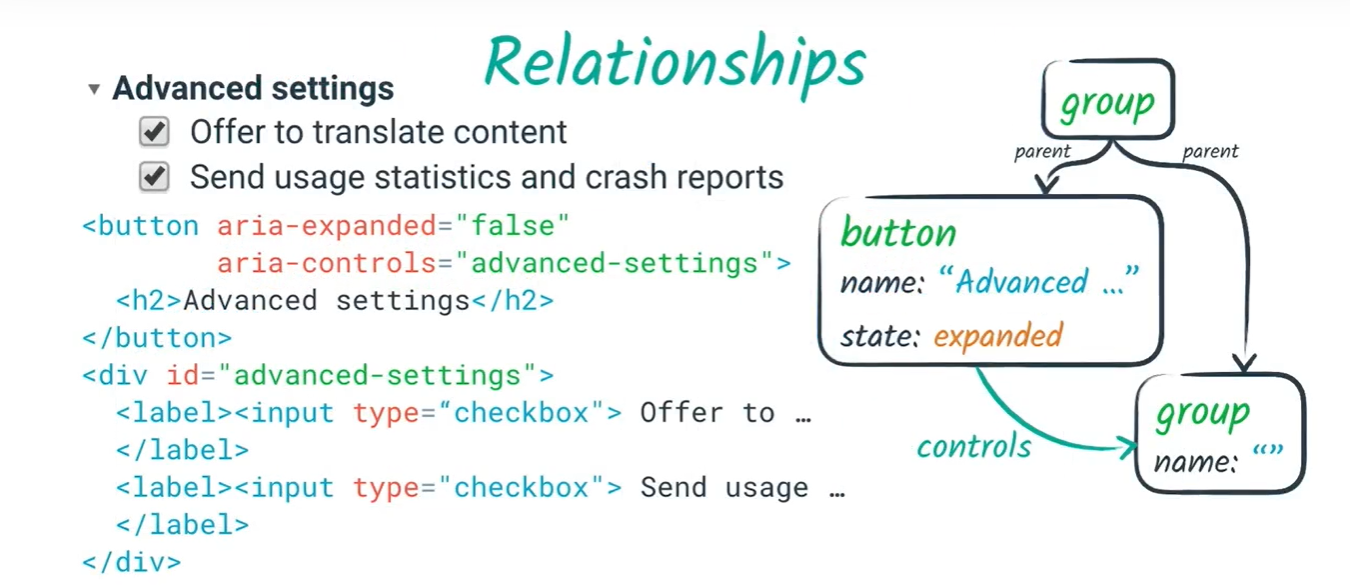 ARIA还可以 表达元素之间的语义关系 ,超出了DOM父子和子女关系范畴,这个控制流程是一个更加复杂的关系示例。在这个示例中,有一个公开小组件形式的按钮,它会控制网页的特定部分是否可见。