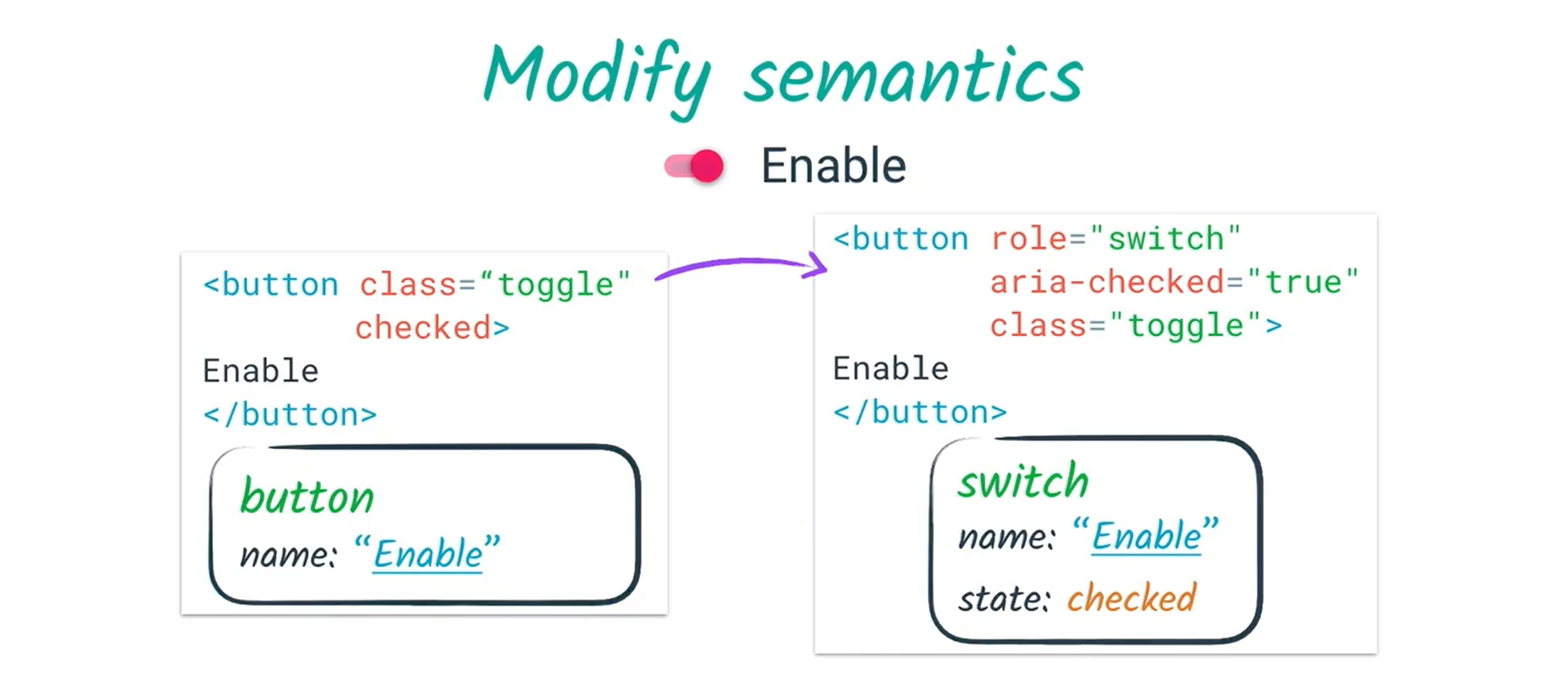 ARIA还可以 在特定界限内修改现有元素语义 ,比如我可以使用按钮元素来实现开关控件,为按钮添加switch ARIA role,以便更准确地表达其语义。