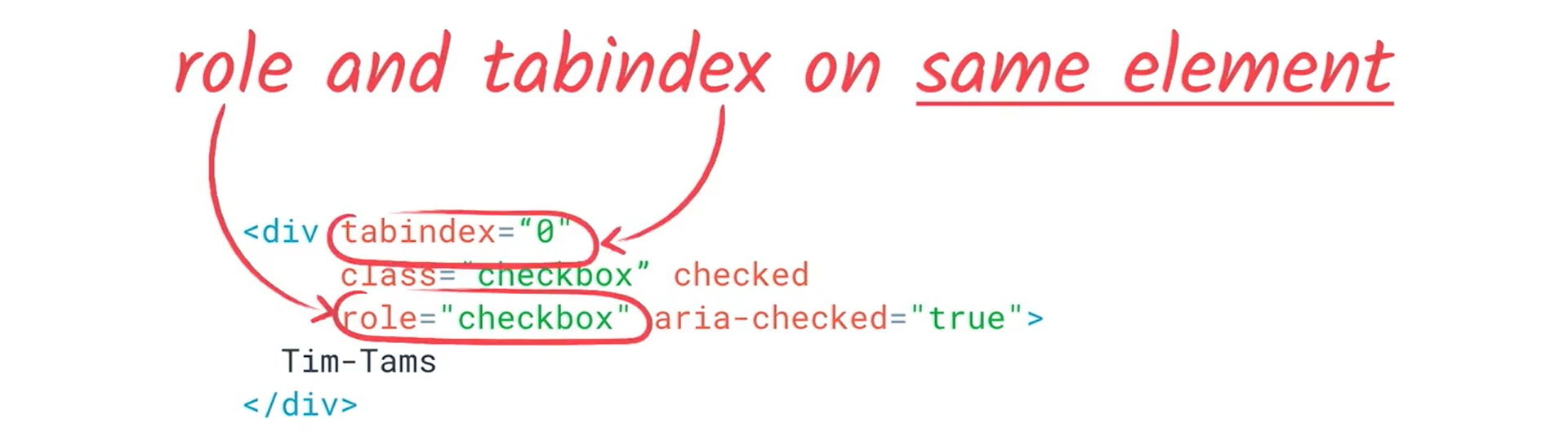 我们在之前的示例中应用role=checkbox时,我们告诉辅助技术该元素应该遵循复选框模式,保证它将具有checked状态,可以是选中状态或未选中状态并且可以使用鼠标或者空格键切换该状态。如果我们遵守这个步骤,那么我们已经通过实现键盘行为实现了该保证部分的功能。