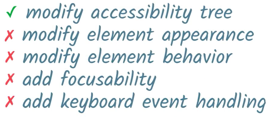 根据我们所使用的属性和属性放置位置两者之间可能稍微不同或者完全不同。但是aria只改变了Accessibility tree,它没有更改添加到目标元素的行为,例如它不会使元素可聚焦或添加键盘事件监听器。