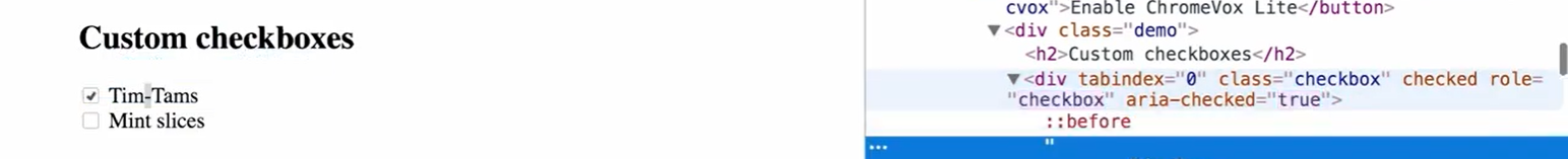 此时ARIA使我们能够向screen reader提供这一额外信息,可以为自定义复选框添加checkbox ARIA 和aria-checked状态,第一个复选框aria-checked状态为true,第二个复选框aria-checked状态为false。