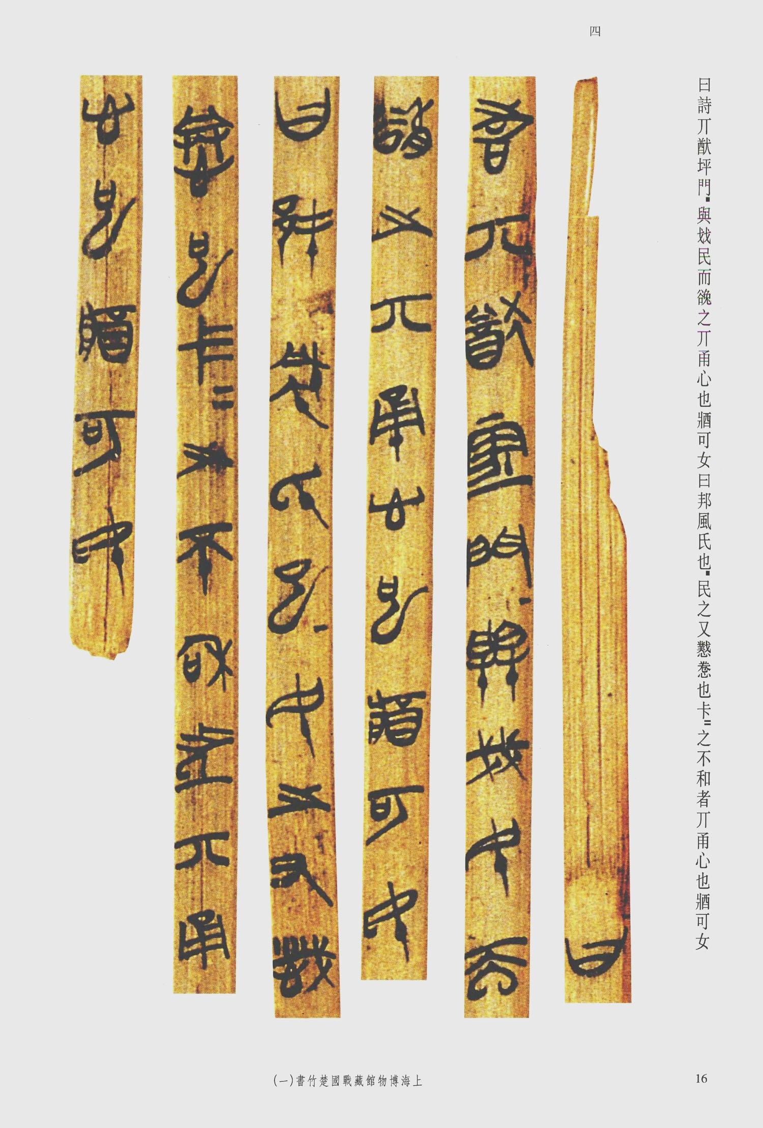 ⧄《關疋》 [4] 之攺 [5] _《梂木》 [6] 之旹 [7] _《灘㞷》 [8] 之𣉻 [9] _《鵲棹》 [10] 之䢜 [11] _《甘棠》之保_《綠衣》之思_《䳛=》 [12] 之情_害 [13] ?曰:童 [14] 而皆臤於丌初者 [15] 也_ [16] 《關疋》㠯色俞 [17] 於豊 [18] [也。始於求思而𠂂 [19] 於百 [20] ]两矣_丌四章則俞 [21] 矣_㠯𨨖*瑟* [22] 之敓,𢚝 [23] 好色之忨 [24] ;㠯鐘鼓之樂[俞君子所]【14】好,反內 [25] 於豊 [26] ,不亦能攺虖_《梂木》福斯 [27] 才 [28] 君子=,不【12】[亦□旹虖_《灘㞷》不]求不可㝵,不攻 [29] 不可能,不亦智𠄨 [30] 虖_《鵲槕》出以百兩,不亦有⿺辶鬯* [31] 虖_《甘【10】[棠》,思] 及丌人,敬㤅 [32] 丌梪 [33] ,丌保厚矣_《甘棠》之㤅,㠯卲(召)公⧄【15】 [34] ⧄情, [35] 㤅也_《關疋》之攺,則以丌思賹 [36] 矣_《梂木》之旹,則以丌彔 [37] 也_《灘㞷》之𣉻 [38] ,則𣉻 [39] 不可㝵 [40] 也_《鵲槕》之䢜 [41] ,則⿺辶鬯*者[□也_《甘棠》之保,美*]【11】邵(召)公也_《绿衣》之憂,思古(故)人也_《䳛=》之情,以丌蜀 [42] 也_【16上】