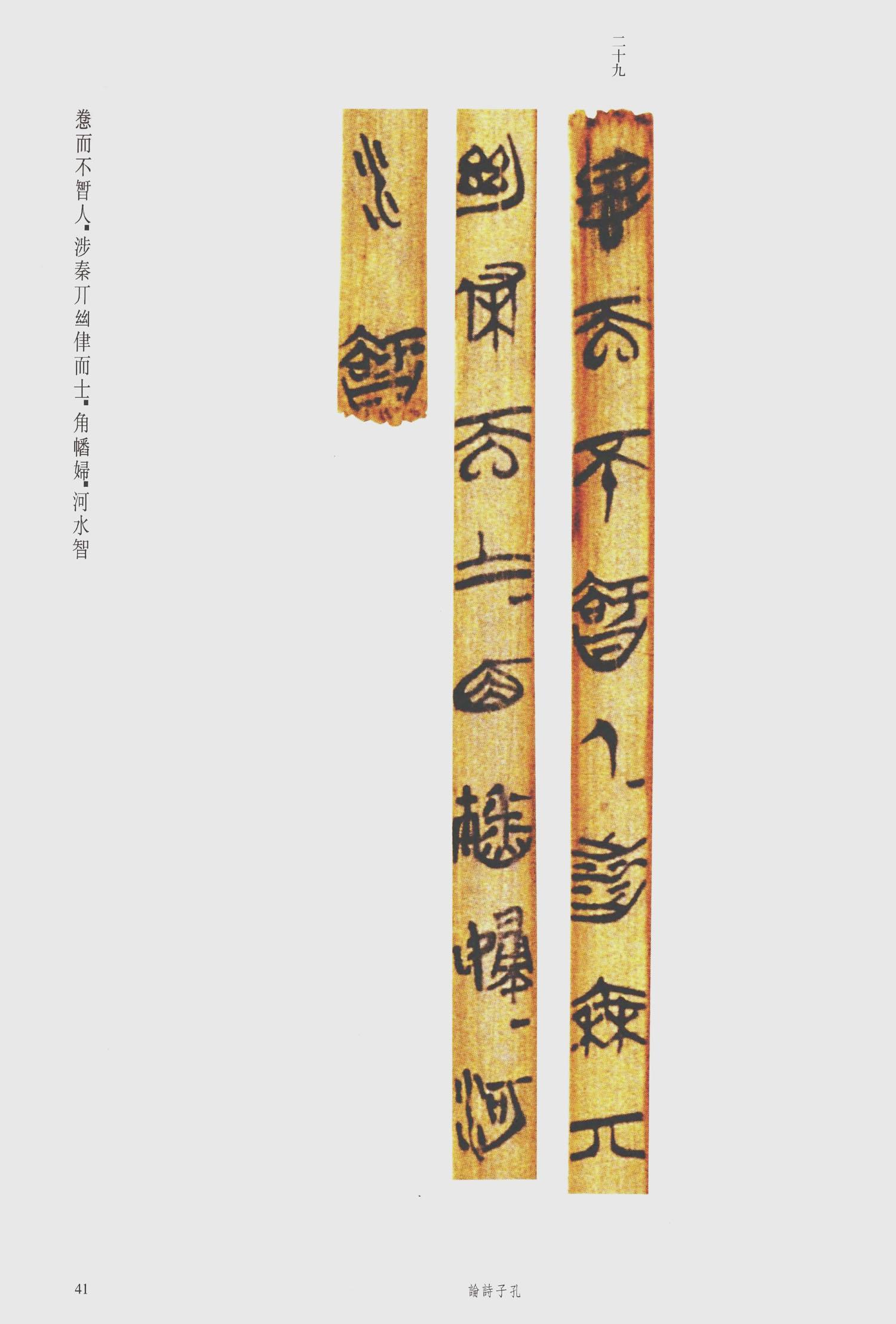 孔子曰:《七率》 [201] 𣉻難 [202] _《中氏》 [203] 君子_《北風》不𢇍 [204] 人之悁 [205] ,子立不⧄【27】⧄《鹿鳴》 [206] 㠯樂⿱厶司* [207] 而會,㠯道交見善而𡥈 [208] ,𠂂虖 [209] 不猒 [210] 人_《兔虘》 [211] 丌甬 [212] 人則𫊟 [213] 取□⧄【23】⧄亞而不文* [214] _《⿰爿𩫏又薺》 [215] 慎密 [216] 而不𣉻 [217] 言_《青⿱興䖵》 [218] 𣉻【28】患而不𣉻 [219] 人_《涉秦》 [220] 丌𢇍 [221] 柎而止 [222] _《角㡀*》 [223] 婦 [224] _《河水》𣉻 [225] [226] ⧄【29】⧄_[《君子]腸腸》 [227] 少人 [228] _《有兔》不奉旹 [229] _《大田》之⿱爫卒 [230] 章𣉻言而又豊 [231] _《小明》不⧄【25】⧄■
