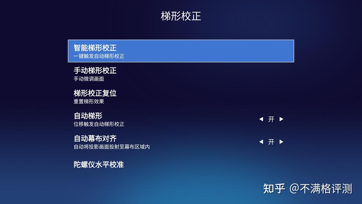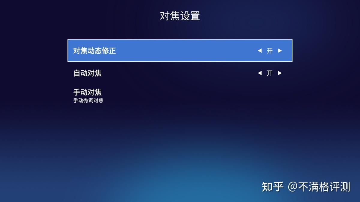 在对焦设置上,可以看到它不但支持自动对焦,还支持对焦动态修正以及手动对焦。这三个功能加在一起的效果是:开机时同步自动对焦、移动投影时实时自动对焦,如果觉得对焦不够精准还可以用手动微调,但其实几乎用不到。