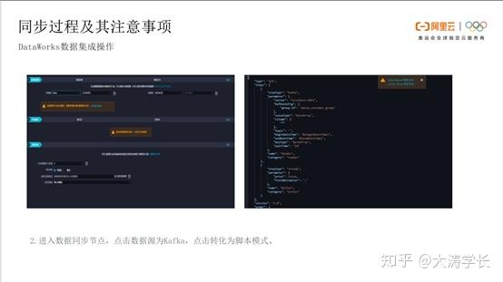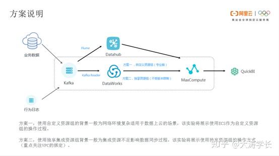 Kafka数据同步到DataWorks有两条链路。一条链路是业务数据和行为日志通过Kafka,再通过Flume 上传到Datahub,以及Max Compute,最终在QuickBI进行展示。另一条链路是业务数据和行为日志通过Kafka以及DataWorks,MaxCompute,最终在QuickBI当中展示。