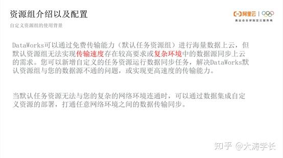 自定义资源组一般针对IDC之间的网络问题。本地网络和云上网络存在差异,如DataWorks可以通过免费传输能力(默认任务资源组)进行海量数据上云,但默认资源组无法实现传输速度存在较高要求或复杂环境中的数据源同步上云的需求。此时用户可以使用自定义资源组可实现复杂环境同步上云的需求,解决DataWorks默 认资源组与您的数据源不通的问题,或实现更高速度的传输能力。然而,自定义资源组主要解决的还是复杂网络环境上云同步问题,打通任意网络环境之间的数据传输同步。