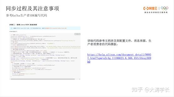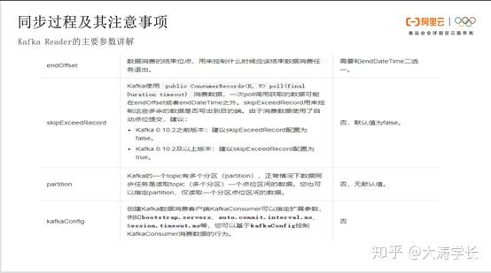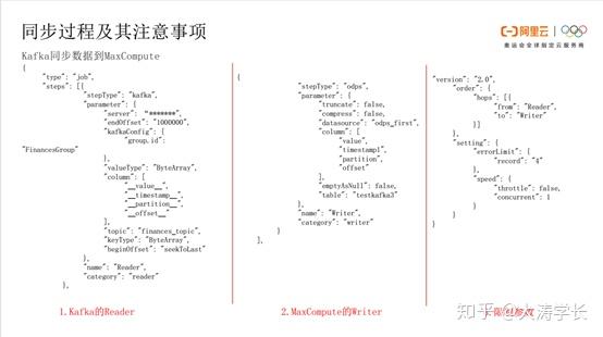Kafka同步数据到MaxCompute: 将下图拆分为三部分。Kafka的Reader端,MaxCompute的Writer端以及限制参数。Reader包含server、endOffset、kafkaConfig、group.id、valueType、ByteArray、column字段、topic、beginOffset、seekToLast等。MaxCompute的Writer端包含覆盖、追加、压缩、查看源码、同步到的表、字段要和Kafka的Reader端做一一对应,最重要的是value数据同步。限制参数,主要有errorlimit,数据超过几个错误后会进行报错;speed,可以限制流速、并发度等。