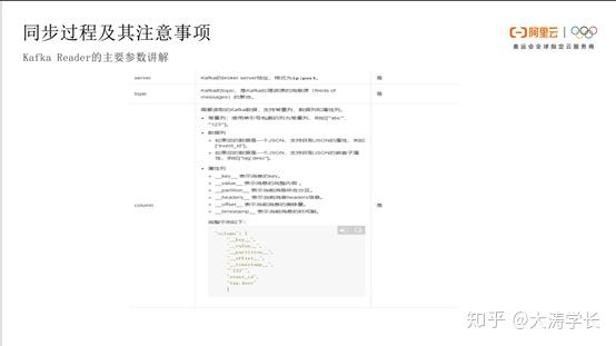 Kafka Reader的主要参数: Kafka Reader的主要参数首先server,上文所述Kafka的默认接入点就是其中一个server,ip:port。注意此处server是必填参数。topic,表示在Kafka部署完成之后,Kafka处理数据源的topic,此处也是必填参数。下一个参数是针对列column,column支持常量列、数据列、属性列。常量列和数据列不太重要。同步的完整消息一般存放在属性列 value 中,如果需要其它信息,如partition、offset、timestamp,也可以在属性列中筛选。column是必填参数。