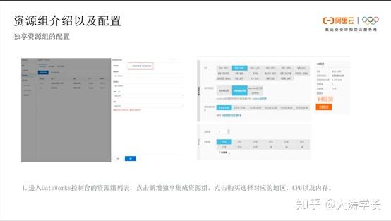 独享资源组的配置: 独享资源组的配置主要需要两步操作,首先进入DataWorks控制台的资源列表,点击新增独享资源组,包括独享集成资源组和独享调度资源组。此处选择新增独享集成资源组,点击购买时仍要注意选择对应的购买方式、区域、资源、内存、时间期限、数量等。