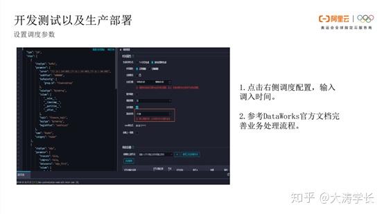 设置调度参数: 业务流程开发数据同步之后,会对相关模型进行一些业务处理,最后设计一些SQL节点、同步节点,进行部署。如下图所示,在右侧点击调度配置,输入调度时间。具体操作可参考DataWorks官方文档完善业务处理流程。