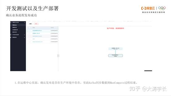 确认业务流程发布成功: 最后在运维中心页面,确认发布是否在生产环境中存在。至此Kafka同步数据到MaxCompute过程结束。到了对应的调度时间,在各个节点或者右上角会有节点的日志展示,可以查看日志运行情况是否正常,或是否需要进行后续操作,部署数据或是相关命令。