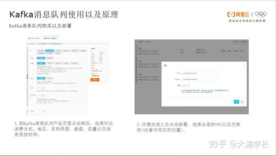Kafka消息队列购买以及部署: 如下图,用户首先可以到Kafka消息队列产品页面点击购买,根据个人情况选择对应包年、包月等消费方式、地区、实例类型、磁盘、流量以及消息存放时间。其中较为重要的一点是要选择对应地区,如果用户的MaxCompute在华北,那么尽量选择华北地区。选择开通完成后需要进行部署。点击部署,选择合适的VPC及其交换机进行部署。