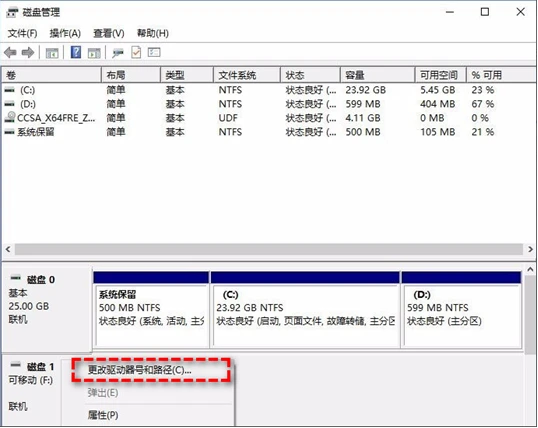 有些时候驱动器号错误,可能导致其不被识别,从而导致问题出现,这时你可以借助Windows系统自带的磁盘管理工具来更改一下故障设备的驱动器号。