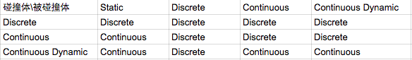 理成一个碰撞检测属性与碰撞检测方式的对应表格就是: