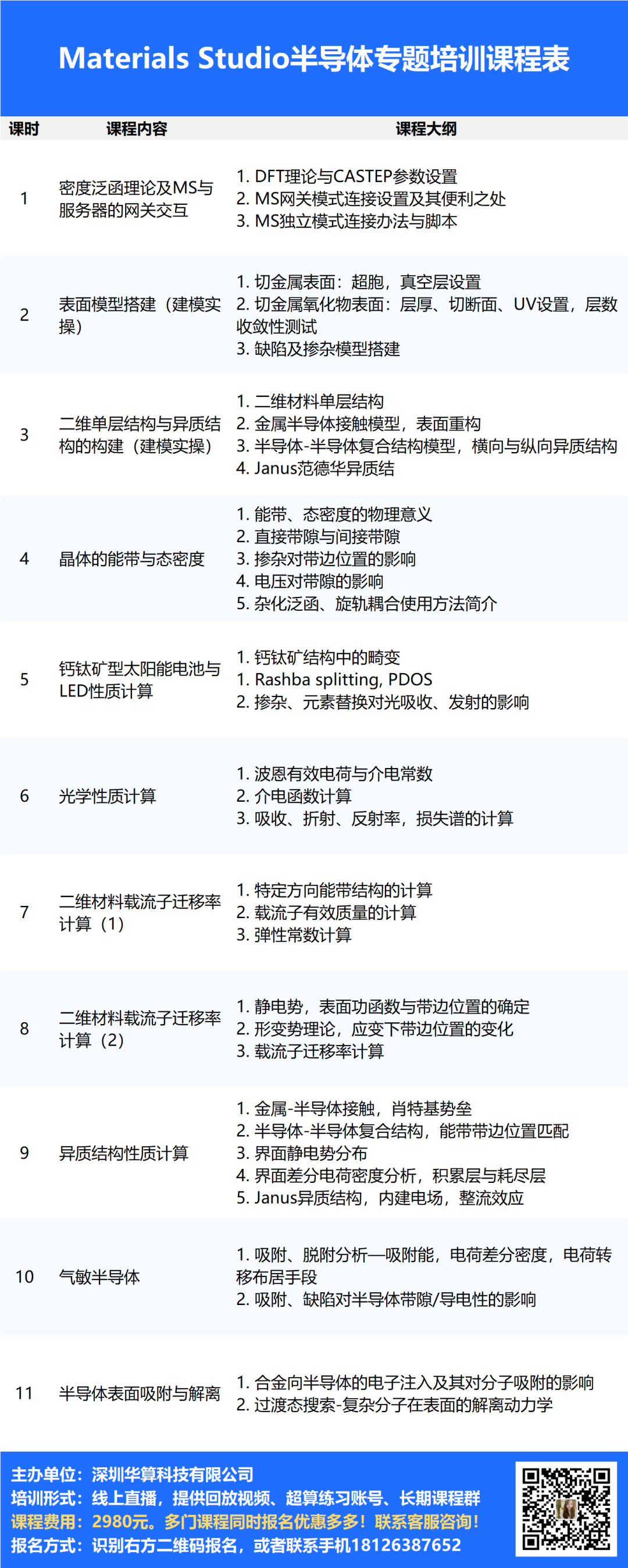 课程主要涵盖钙钛矿太阳能电池、光吸收、介电函数、介电常数、有效质量、载流子迁移率、金属半导体异质结构、Janus异质结构、内建电场、整流效应、气敏半导体等
