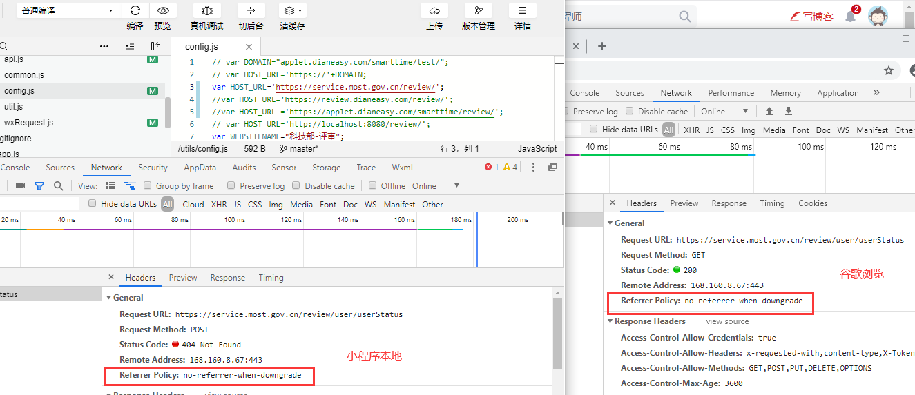 后台是自己开发的接口程序,通过postman可以调通接口,但是通过微信小程序调用报404,微信小程序后台已经配置好了https开头的域名。