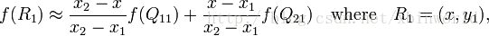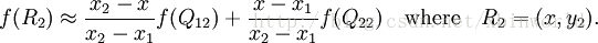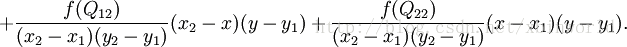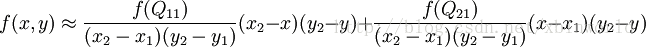 假如我们想得到未知函数 f 在点 P = (x, y) 的值,假设我们已知函数 f 在 Q11 = (x1, y1)、Q12 = (x1, y2), Q21 = (x2, y1) 以及 Q22 = (x2, y2) 四个点的值。首先在 x 方向进行线性插值,得到