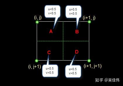 如果(i+u, j+v)落在A区,即u<0.5, v<0.5,则将左上角象素的灰度值赋给待求象素,同理,落在B区则赋予右上角的象素灰度值,落在C区则赋予左下角象素的灰度值,落在D区则赋予右下角象素的灰度值。