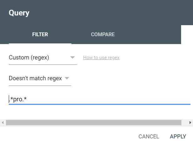 Google Search Console的支持正则表达式否定筛选,直接选择Doesn’t match regex即可,下面的正则表达式跟非否定筛选写法一致,如需要筛选不包含pro的词,如下图: